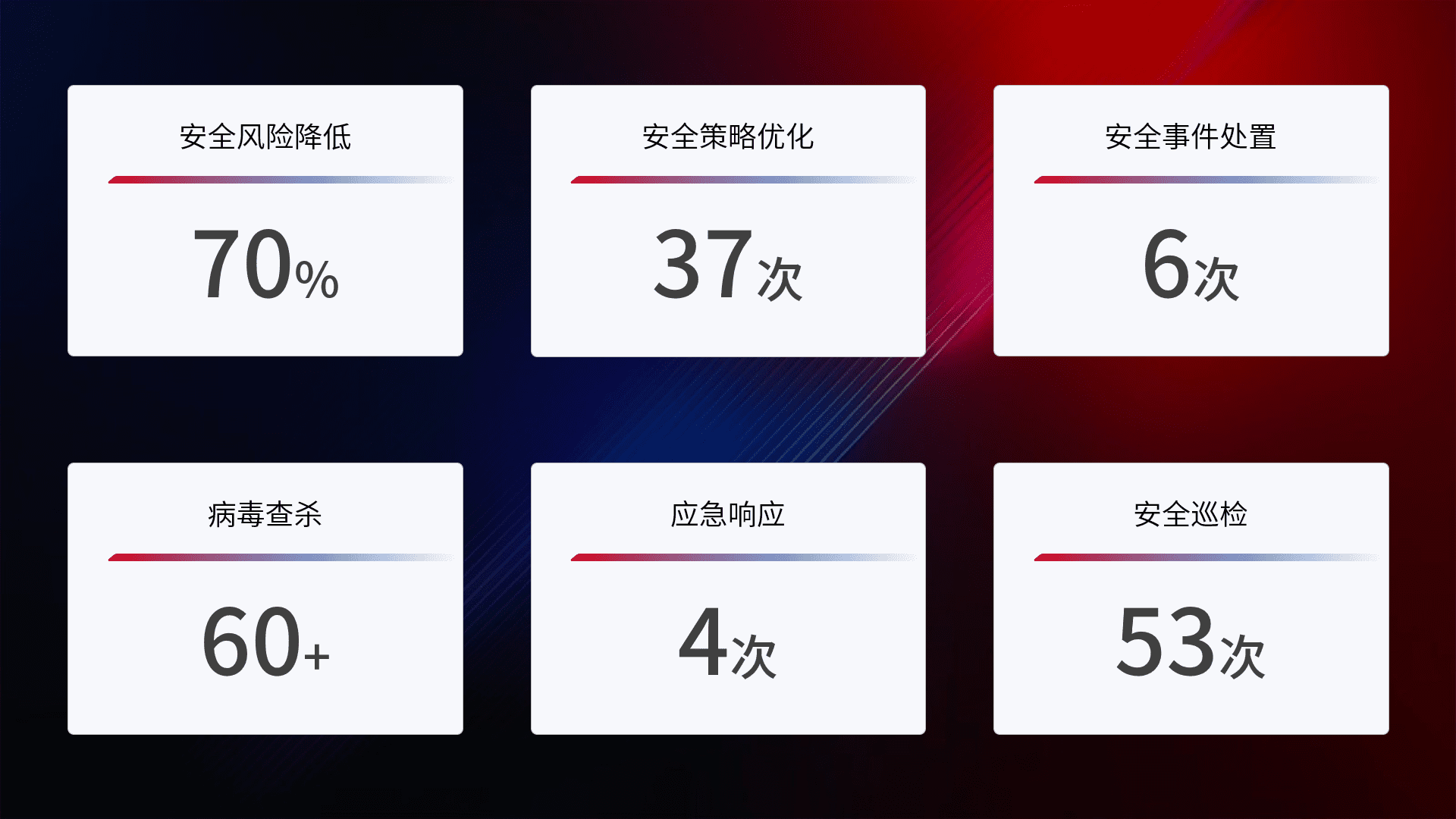 提供全面的安全事件报告体系,,,包括处置报告、、、、周报、、季度和年度总结,,,,结合持续监控,,,帮助客户深入了解网络安全状况。。。
